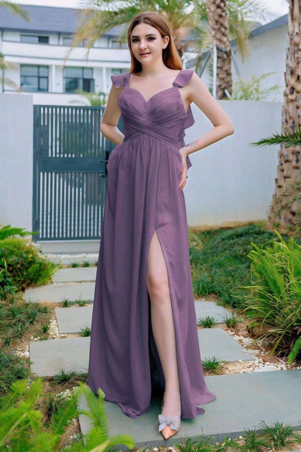 Back Details: Zipper Embellishment: Split, Ruffles Fabrics: Chiffon Length: Floor Length Neckline: V-Neck Silhouette Style: A-Line Sleeve Length: Sleeveless Waist...